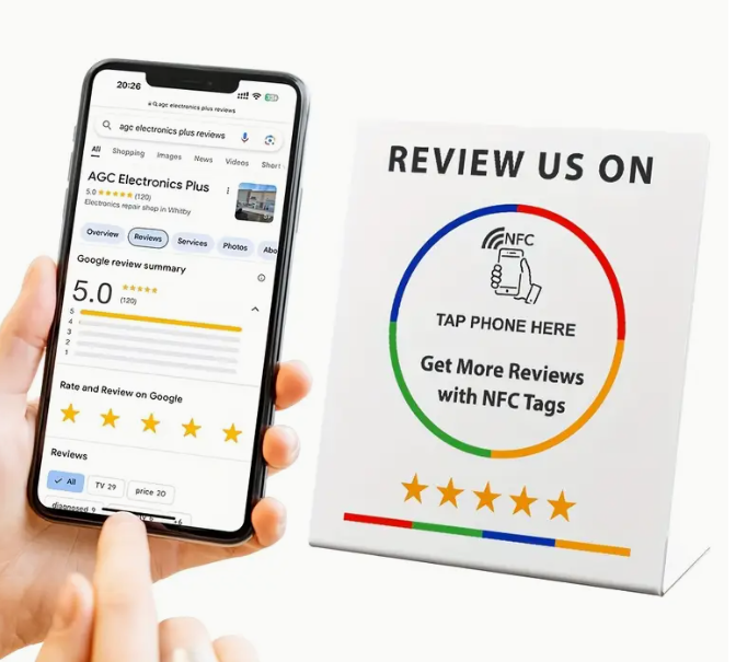 NFC (Near Field Communication) and QR code review stands are in-store display units that allow customers to quickly leave reviews by tapping their phone on the NFC tag or scanning the QR code with their camera. These stands make it easy to capture real-time feedback from your customers.